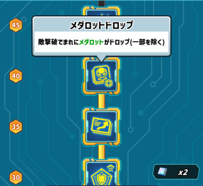なぜ、研究の「精密研究」のランクを40まで上げる必要があるのか?という疑問が出てくるかもしれませんが、ランク40までいくと「メダロットドロップ」という能力が追加されます。プレイ中にメダロットがランダムでアイテムのように落ちてくるのですが、それ以外にロボトルのクイックバトルをすると必ず1体のNランクのメダロットが貰えるのです。